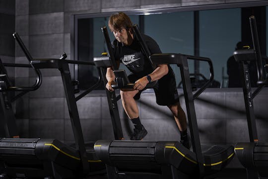 Material necesario: Mancuernas o barra de peso medio. Banda de activación. Powerbands (Invento). Step opcional